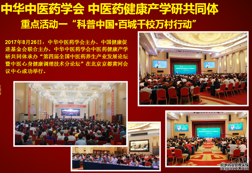 2017年8月26日:中华中医药学会主办、中国健康促进基金会联合主办,中华中医药学会中医药健康产学研共同体承办“第四届全国中医药养生产业发展论坛暨中医心身健康调理技术分论坛”在北京京都黄河会议中心成功举行。